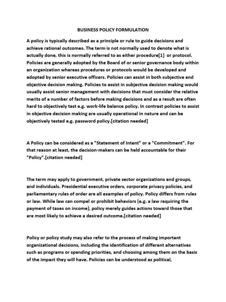 BUSINESS POLICY FORMULATION A policy is typically described as a principle or rule to guide decisions and achieve rational outcomes.