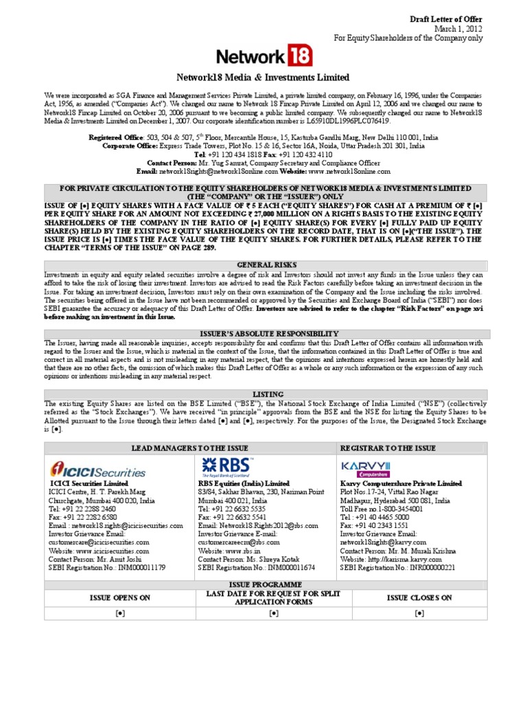 Draft Letter of Offer / DLOF Equity Share(s) / Share(s) Equity Shareholder/ Shareholder Investor(s) Issue / Rights Issue / Rights Issue of Network18