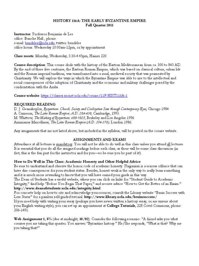 Hall , phone: e-mail: bendelee@ucla.edu; twitter: bendelee office hours: Wednesday 10:00am-12pm, or by appointment Class meets: Monday, Wednesday, 3:30-4:45pm, Haines 220 Course description: This course deals with the history of the Eastern Mediterranean from ca. 300 to 843 AD. By the end of these five centuries, the Eastern Roman Empire, which was based on classical culture, urban life and the Roman imperial tradition, was transformed into a rural, medieval society that was permeated by Christianity. We will explore the ways in which the Byzantine Empire was able to rise to the intellectual and social consequences of the adoption of Christianity and the economic and military challenges posed by the confrontation with the Arabs. Course website: https://classes.sscnet.ucla.edu/course/11F-HIST116A-1 REQUIRED READING D. J. Geanakoplos, Byzantium. Church, Society and Civilization Seen through Contemporary Eyes, Chicago 1984 A. Cameron, The Later Roman Empire, A.D. 284-430, Cambridge, 1993. M. Whittow, The Making of Byzantium, 600-1025, Berkeley and Los Angeles 1996 Ammianus Marcellinus, The Later Roman Empire (A.D. 354-378), London 1986. Any assignments that are not listed above, but included in the syllabus, will be posted on the course website. ASSIGNMENTS AND EXAMS Attendance at all lectures is mandatory. You will not be able to do well in this class unless you attend all lectures. It is essential that you do all the assigned readings before each class, as there will be some class discussion (in fact, this is the fun part for the instructor and for youso be sure you be part of it!). How to Do Well in This Class: Academic Honesty and Other Helpful Advice Be sure to understand and observe the honor code of academic honesty. Plagiarism is a serious offence that can have dire consequences for your student status. Besides, honest work is the only way to really learn something and it is much more rewarding to know that you will have earned your grade in this way. The Dean of Students has a useful website, where you can click on links for Student Guide to Academic Integrity, find help Before You Begin That Paper, and receive advice How to Get the Better of an Exam. http://www.deanofstudents.ucla.edu/integrity.html For concrete help on how to cite and acknowledge your sources, consult the Library website Bruin Success with Less Stress for a painless self-guided tutorial. http://www.library.ucla.edu/bruinsuccess/ If you need help with writing your essay (perhaps you have never written a history essay, or are unsure about your English writing style), you can set up an appointment at College Tutorials, 228 Covel Commons, phone: 206-1491. Web Assignment 1, 5% (due at midnight, 10/02): Consider the following scenario: A friend asks you what courses you are taking this quarter. You answer Byzantine history. He/She responds, What is that? Why are you taking that?