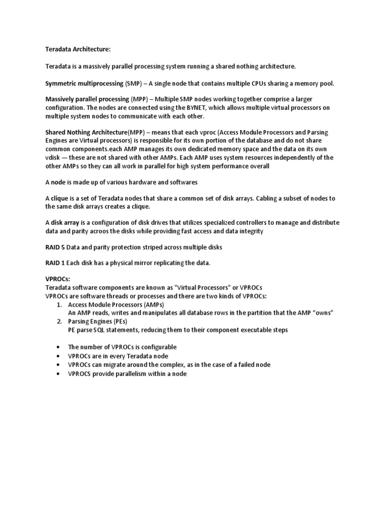 Teradata Architecture: Teradata is a massively parallel processing system running a shared nothing architecture.