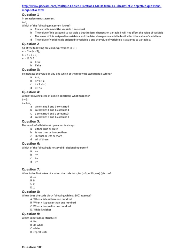 http://www.psexam.com/Multiple-Choice-Questions-MCQs-from-C++/basics-of-c-objective-questionsmcqs-set-4.