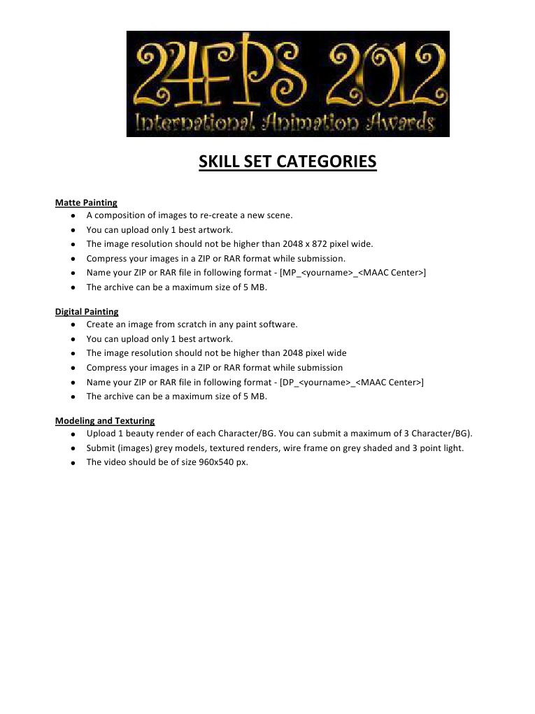 Matte Painting A composition of images to re-create a new scene. You can upload only 1 best artwork. The image resolution should not be higher than 2048 x 872 pixel wide. Compress your images in a ZIP or RAR format while submission. Name your ZIP or RAR file in following format - [MP_<yourname>_<MAAC Center>] The archive can be a maximum size of 5 MB. Digital Painting Create an image from scratch in any paint software. You can upload only 1 best artwork. The image resolution should not be higher than 2048 pixel wide Compress your images in a ZIP or RAR format while submission Name your ZIP or RAR file in following format - [DP_<yourname>_<MAAC Center>] The archive can be a maximum size of 5 MB. Modeling and Texturing Upload 1 beauty render of each Character/BG. You can submit a maximum of 3 Character/BG). Submit (images) grey models, textured renders, wire frame on grey shaded and 3 point light. The video should be of size 960x540 px.