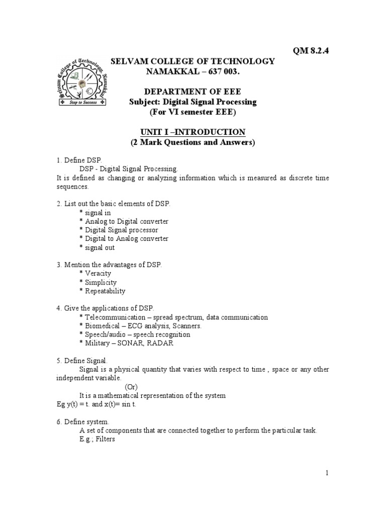 SELVAM COLLEGE OF TECHNOLOGY NAMAKKAL 637 003. DEPARTMENT OF EEE Subject: Digital Signal Processing (For VI semester EEE) UNIT I INTRODUCTION (2 Mark Questions and Answers)
