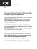 Highly motivated to work in a professional environment with a growing organization and to put in best efforts for the technical enhancements of organization and myself. Looking for a high-grown organization with a competitive and challenging environment that creates an ideal condition for delivering high quality services. Aspiring to associate with an organization, which offers a congenial environment for growth Want to build a career with leading corporate having committed and dedicated people whom I will work with all my potential Looking for a challenging role so that I can use my capabilities through sincerely dedication and hard work to move up the graph of the Organization. Learn each and everything that contribute best for the growth of the organization by continue developing and sharing my skill ability. I would always prepare myself for contributing in the progress of organization. The development of the company would be my prime area of interest. It would help me to create a good impression among my companions. I would use my ideology while working. So, I will come to know the strength of my skills A Position that will harness strong problem solving analytical interpersonal and networking skills and will allow working with a high performance team working on cutting edge of technology. In today's world, competition has reached its peak. It is not easy to stabilize ourselves in this neck-cut competition. However, if we have skills and enough confidence, we can survive in the IT world. For that, I will enhance my skills and make myself capable in the field To enhance my working capacities, professional skills, business efficiencies and to serve my organization in best way with sheer determination and commitment. Want to build a career with leading Corporate having committed and dedicated people whom I will work with all my potential and enhance my skills A growth oriented profile in a company where my skill knowledge is effectively used for the success of the organization. Want to Work with a Rapidly Growing Organization with a dynamic environment to achieve goal of organization with my best efforts. Seeking challenging career in Social Development sector to get a position of responsibility, using my skills efficiency to communicate my ideas and views and commit myself for achieving organization objectives with the team effort and my positive attitude and performance.