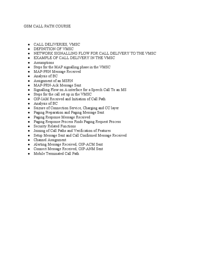 CALL DELIVERIES, VMSC DEFINITION OF VMSC NETWORK SIGNALLING FLOW FOR CALL DELIVERY TO THE VMSC EXAMPLE OF CALL DELIVERY IN THE VMSC Assumptions Steps for the MAP signalling phase in the VMSC MAP-PRN Message Received Analysis of BC Assignment of an MSRN MAP-PRN-Ack Message Sent Signalling Flow on A-interface for a Speech Call To an MS Steps for the call set up in the VMSC OIP-IAM Received and Initiation of Call Path Analysis of BC Seizure of Connection Service, Charging and CC layer Paging Preparation and Paging Message Sent Paging Response Message Received Paging Response Process Finds Paging Request Process Security Related Functions Joining of Call Paths and Verification of Features Setup Message Sent and Call Confirmed Message Received Channel Assignment Alerting Message Received, OIP-ACM Sent Connect Message Received, OIP-ANM Sent Mobile Terminated Call Path