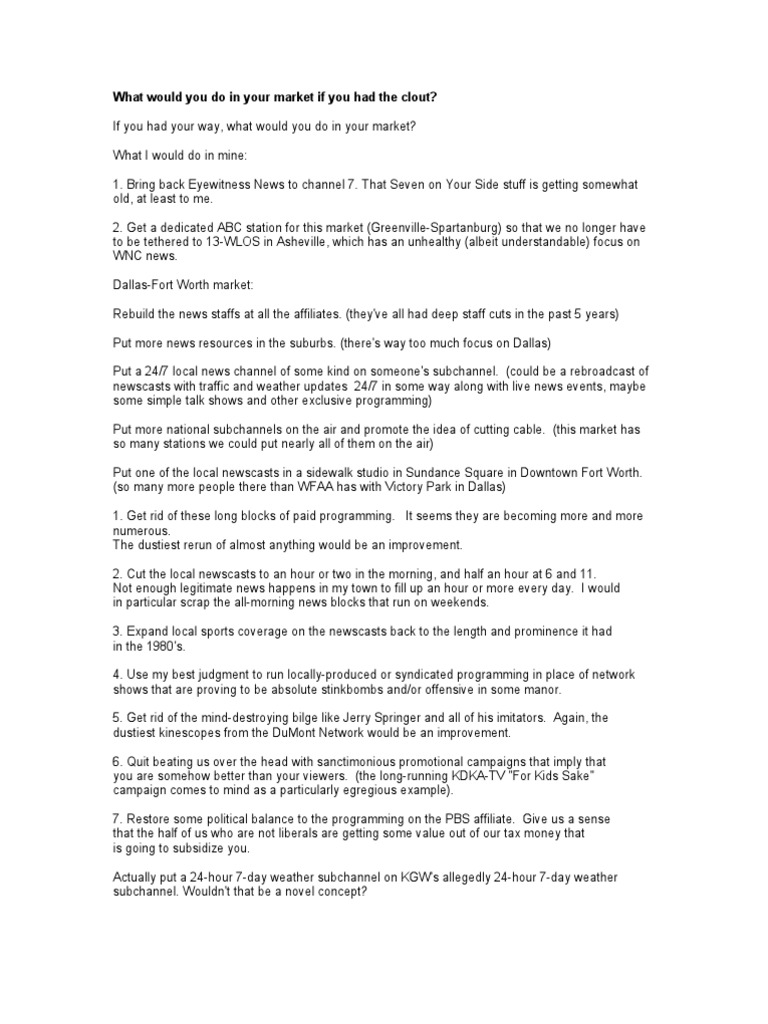 If you had your way, what would you do in your market? What I would do in mine: 1. Bring back Eyewitness News to channel 7. That Seven on Your Side stuff is getting somewhat old, at least to me. 2. Get a dedicated ABC station for this market (Greenville-Spartanburg) so that we no longer have to be tethered to 13-WLOS in Asheville, which has an unhealthy (albeit understandable) focus on WNC news. Dallas-Fort Worth market: Rebuild the news staffs at all the affiliates. (they've all had deep staff cuts in the past 5 years) Put more news resources in the suburbs. (there's way too much focus on Dallas) Put a 24/7 local news channel of some kind on someone's subchannel. (could be a rebroadcast of newscasts with traffic and weather updates 24/7 in some way along with live news events, maybe some simple talk shows and other exclusive programming) Put more national subchannels on the air and promote the idea of cutting cable. (this market has so many stations we could put nearly all of them on the air) Put one of the local newscasts in a sidewalk studio in Sundance Square in Downtown Fort Worth. (so many more people there than WFAA has with Victory Park in Dallas) 1. Get rid of these long blocks of paid programming. It seems they are becoming more and more numerous. The dustiest rerun of almost anything would be an improvement. 2. Cut the local newscasts to an hour or two in the morning, and half an hour at 6 and 11. Not enough legitimate news happens in my town to fill up an hour or more every day. I would in particular scrap the all-morning news blocks that run on weekends. 3. Expand local sports coverage on the newscasts back to the length and prominence it had in the 1980's. 4. Use my best judgment to run locally-produced or syndicated programming in place of network shows that are proving to be absolute stinkbombs and/or offensive in some manor. 5. Get rid of the mind-destroying bilge like Jerry Springer and all of his imitators. Again, the dustiest kinescopes from the DuMont Network would be an improvement. 6. Quit beating us over the head with sanctimonious promotional campaigns that imply that you are somehow better than your viewers. (the long-running KDKA-TV "For Kids Sake" campaign comes to mind as a particularly egregious example). 7. Restore some political balance to the programming on the PBS affiliate. Give us a sense that the half of us who are not liberals are getting some value out of our tax money that is going to subsidize you. Actually put a 24-hour 7-day weather subchannel on KGW's allegedly 24-hour 7-day weather subchannel. Wouldn't that be a novel concept?
