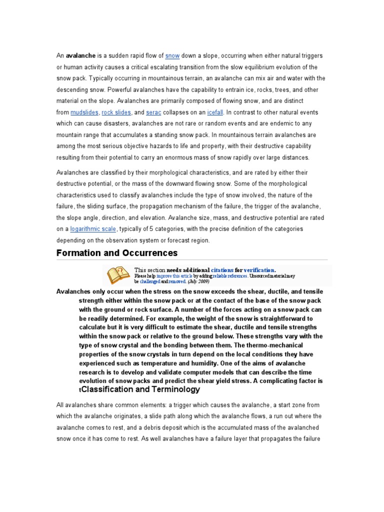 a critical escalating transition from the slow equilibrium evolution of the snow pack. Typically occurring in mountainous terrain, an avalanche can mix air and water with the descending snow. Powerful avalanches have the capability to entrain ice, rocks, trees, and other material on the slope. Avalanches are primarily composed of flowing snow, and are distinct from mudslides, rock slides, and serac collapses on an icefall. In contrast to other natural events which can cause disasters, avalanches are not rare or random events and are endemic to any mountain range that accumulates a standing snow pack. In mountainous terrain avalanches are among the most serious objective hazards to life and property, with their destructive capability resulting from their potential to carry an enormous mass of snow rapidly over large distances. Avalanches are classified by their morphological characteristics, and are rated by either their destructive potential, or the mass of the downward flowing snow. Some of the morphological characteristics used to classify avalanches include the type of snow involved, the nature of the failure, the sliding surface, the propagation mechanism of the failure, the trigger of the avalanche, the slope angle, direction, and elevation. Avalanche size, mass, and destructive potential are rated on a logarithmic scale, typically of 5 categories, with the precise definition of the categories depending on the observation system or forecast region.
