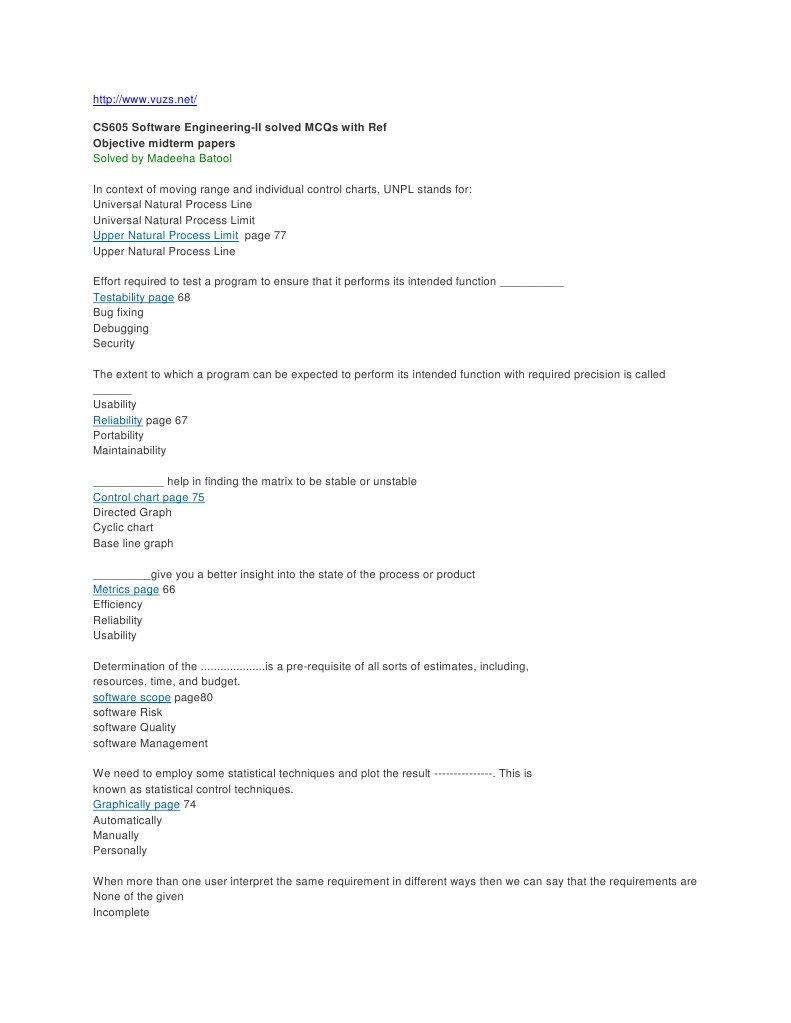 net/ CS605 Software Engineering-II solved MCQs with Ref Objective midterm papers Solved by Madeeha Batool In context of moving range and individual control charts, UNPL stands for: Universal Natural Process Line Universal Natural Process Limit Upper Natural Process Limit page 77 Upper Natural Process Line Effort required to test a program to ensure that it performs its intended function __________ Testability page 68 Bug fixing Debugging Security The extent to which a program can be expected to perform its intended function with required precision is called ______ Usability Reliability page 67 Portability Maintainability ___________ help in finding the matrix to be stable or unstable Control chart page 75 Directed Graph Cyclic chart Base line graph _________give you a better insight into the state of the process or product Metrics page 66 Efficiency Reliability Usability Determination of the ....................is a pre-requisite of all sorts of estimates, including, resources, time, and budget. software scope page80 software Risk software Quality software Management We need to employ some statistical techniques and plot the result ---------------. This is known as statistical control techniques. Graphically page 74 Automatically Manually Personally When more than one user interpret the same requirement in different ways then we can say that the requirements are None of the given Incomplete