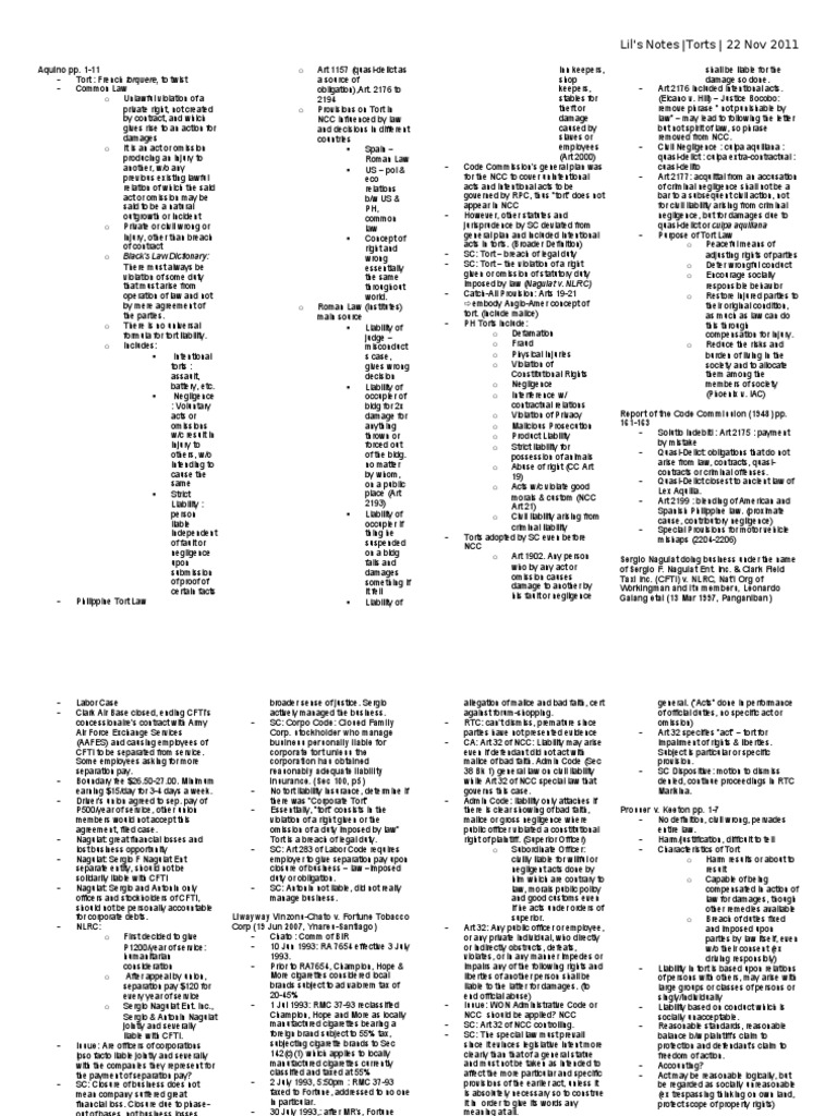 Aquino pp. 1-11 Tort : French torquere, to twist Common Law o Unlawful violation of a private right, not created by contract, and which gives rise to an action for damages o It is an act or omission producing an injury to another, w/o any previous existing lawful relation of which the said act or omission may be said to be a natural outgrowth or incident o Private or civil wrong or injury, other than breach of contract o Black's Law Dictionary: There must always be violation of some duty that must arise from operation of law and not by mere agreement of the parties. o There is no universal formula for tort liability. o Includes: Intentional torts : assault, battery, etc. Negligence : Voluntary acts or omissions w/c result in injury to others, w/o intending to cause the same Strict Liability : person liable independent of fault or negligence upon submission of proof of certain facts Philippine Tort Law o Art 1157 (quasi-delict as a source of obligation),Art. 2176 to 2194 Provisions on Tort in NCC influenced by law and decisions in different countries Spain Roman Law US pol & eco relations b/w US & PH, common law Concept of right and wrong essentially the same throughout world. Roman Law (Institutes) main source Liability of judge misconduct s case, gives wrong decision Liability of occupier of bldg for 2x damage for anything thrown or forced out of the bldg. no matter by whom, on a public place (Art 2193) Liability of occupier if thing he suspended on a bldg falls and damages something if it fell Liability of inn keepers, shop keepers, stables for theft or damage caused by slaves or employees (Art 2000) Code Commission's general plan was for the NCC to cover unintentional acts and intentional acts to be governed by RPC, thus "tort" does not appear in NCC However, other statutes and jurisprudence by SC deviated from general plan and included intentional acts in torts. (Broader Definition) SC: Tort breach of legal duty SC: Tort the violation of a right given or omission of statutory duty imposed by law (Naguiat v. NLRC) Catch-All Provision: Arts 19-21 embody Anglo-Amer concept of tort. (include malice) PH Torts include: o Defamation o Fraud o Physical Injuries o Violation of Constitutional Rights o Negligence o Interference w/ contractual relations o Violation of Privacy o Malicious Prosecution o Product Liability o Strict liability for possession of animals o Abuse of right (CC Art 19) o Acts w/c violate good morals & custom (NCC Art 21) o Civil liability arising from criminal liability Torts adopted by SC even before NCC o Art 1902. Any person who by any act or omission causes damage to another by his fault or negligence shall be liable for the damage so done. Art 2176 included intentional acts. (Elcano v. Hill) Justice Bocobo: remove phrase " not punishable by law" may lead to following the letter but not spirit of law, so phrase removed from NCC. Civil Negligence : culpa aquiliana : quasi-delict : culpa extra-contractual : cuasi-delito Art 2177: acquittal from an accusation of criminal negligence shall not be a bar to a subsequent civil action, not for civil liability arising from criminal negligence, but for damages due to quasi-delict or culpa aquiliana Purpose of Tort Law o Peaceful means of adjusting rights of parties o Deter wrongful conduct o Encourage socially responsible behavior o Restore injured parties to their original condition, as much as law can do this through compensation for injury. o Reduce the risks and burden of living in the society and to allocate them among the members of society (Phoenix v. IAC)