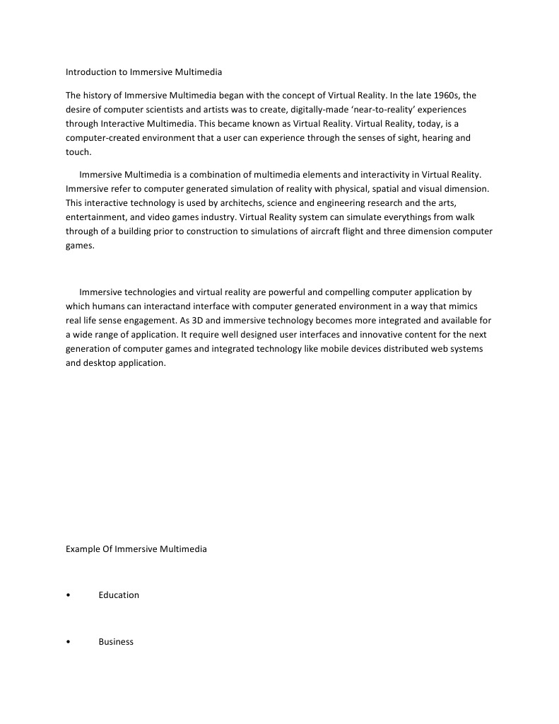 In the late 1960s, the desire of computer scientists and artists was to create, digitally-made near-to-reality experiences through Interactive Multimedia. This became known as Virtual Reality. Virtual Reality, today, is a computer-created environment that a user can experience through the senses of sight, hearing and touch. Immersive Multimedia is a combination of multimedia elements and interactivity in Virtual Reality. Immersive refer to computer generated simulation of reality with physical, spatial and visual dimension. This interactive technology is used by architechs, science and engineering research and the arts, entertainment, and video games industry. Virtual Reality system can simulate everythings from walk through of a building prior to construction to simulations of aircraft flight and three dimension computer games.