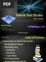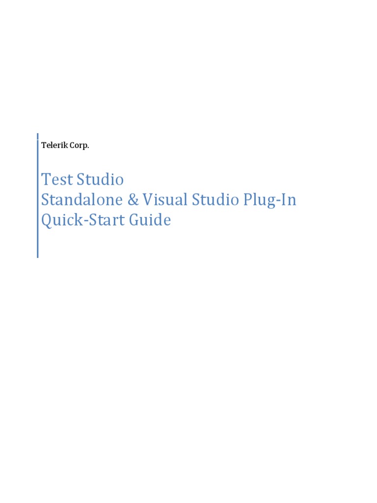 Create your First Test ................................................................................................................................ 3 Standalone Web Test ............................................................................................................................ 3 Standalone WPF Test ............................................................................................................................ 6 Standalone Silverlight Test.................................................................................................................... 8 Visual Studio Plug-In Web Test ........................................................................................................... 12 Visual Studio Plug-In WPF Test ........................................................................................................... 16 Visual Studio Plug-In Silverlight Test ................................................................................................... 20 Recording Toolbar Overview .................................................................................................................. 24 Add Quick Verification Steps................................................................................................................... 25 Create Advanced Test Verifications ........................................................................................................ 27 Create a Data Driven Test ....................................................................................................................... 30 Test Execution (Standalone) ................................................................................................................... 34 Test Execution (VS Plug-In) ..................................................................................................................... 37 How to Resolve Test Step Failures .......................................................................................................... 40 Elements Pane Overview ........................................................................................................................ 42 Change How an Element Is Found .......................................................................................................... 44 Use the 3D Viewer .................................................................................................................................. 47 Perform Common Automation Tasks ..................................................................................................... 51 Telerik Test Run Configuration (Standalone) .......................................................................................... 52 Telerik Test Run Configuration (VS Plug-In) ............................................................................................ 53 Steps Pane Overview (Standalone) ......................................................................................................... 54 Steps Pane Overview (VS Plug-In) ........................................................................................................... 55 DOM Explorer Tool Window Overview ................................................................................................... 57 VS Plugin Telerik Test Tab Overview ....................................................................................................... 60 Customize Test Using C# or VB.NET Code............................................................................................... 62 Create a Test with a Custom Coded Step............................................................................................ 62 Create a Test That Uses a Code Behind File ........................................................................................ 65 How to Reference an Element in a Code Behind File ......................................................................... 68 2