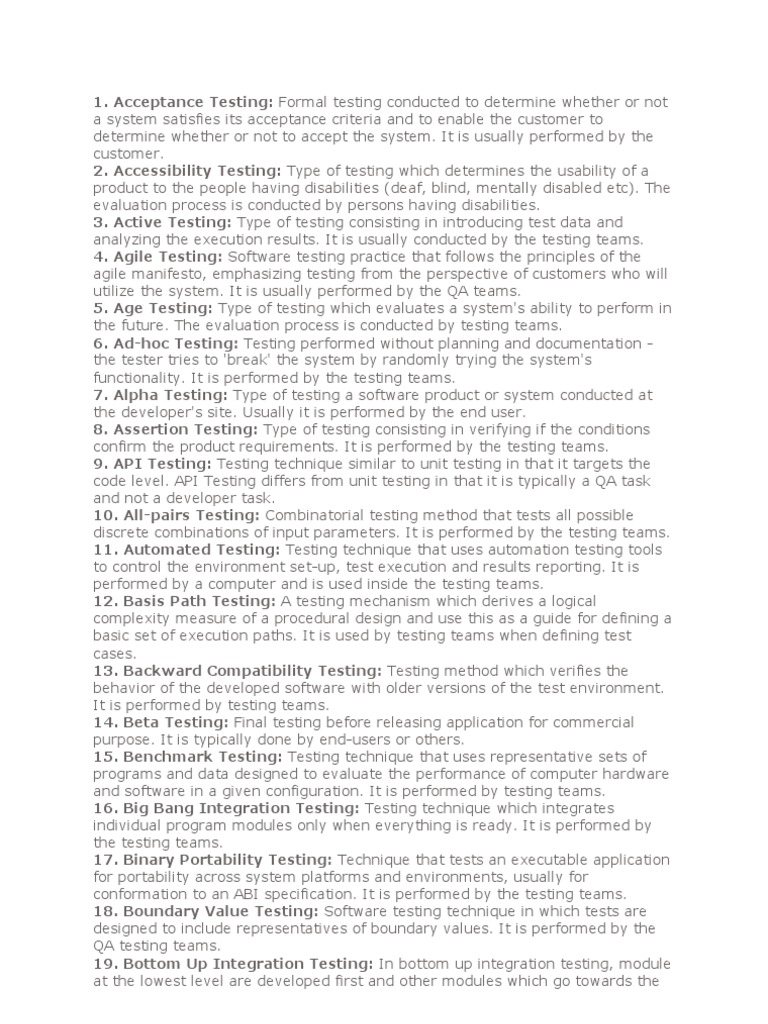Acceptance Testing: Formal testing conducted to determine whether or not a system satisfies its acceptance criteria and to enable the customer to determine whether or not to accept the system. It is usually performed by the customer. 2. Accessibility Testing: Type of testing which determines the usability of a product to the people having disabilities (deaf, blind, mentally disabled etc). The evaluation process is conducted by persons having disabilities. 3. Active Testing: Type of testing consisting in introducing test data and analyzing the execution results. It is usually conducted by the testing teams. 4. Agile Testing: Software testing practice that follows the principles of the agile manifesto, emphasizing testing from the perspective of customers who will utilize the system. It is usually performed by the QA teams. 5. Age Testing: Type of testing which evaluates a system's ability to perform in the future. The evaluation process is conducted by testing teams. 6. Ad-hoc Testing: Testing performed without planning and documentation the tester tries to 'break' the system by randomly trying the system's functionality. It is performed by the testing teams. 7. Alpha Testing: Type of testing a software product or system conducted at the developer's site. Usually it is performed by the end user. 8. Assertion Testing: Type of testing consisting in verifying if the conditions confirm the product requirements. It is performed by the testing teams. 9. API Testing: Testing technique similar to unit testing in that it targets the code level. API Testing differs from unit testing in that it is typically a QA task and not a developer task. 10. All-pairs Testing: Combinatorial testing method that tests all possible discrete combinations of input parameters. It is performed by the testing teams. 11. Automated Testing: Testing technique that uses automation testing tools to control the environment set-up, test execution and results reporting. It is performed by a computer and is used inside the testing teams. 12. Basis Path Testing: A testing mechanism which derives a logical complexity measure of a procedural design and use this as a guide for defining a basic set of execution paths. It is used by testing teams when defining test cases. 13. Backward Compatibility Testing: Testing method which verifies the behavior of the developed software with older versions of the test environment. It is performed by testing teams. 14. Beta Testing: Final testing before releasing application for commercial purpose. It is typically done by end-users or others. 15. Benchmark Testing: Testing technique that uses representative sets of programs and data designed to evaluate the performance of computer hardware and software in a given configuration. It is performed by testing teams. 16. Big Bang Integration Testing: Testing technique which integrates individual program modules only when everything is ready. It is performed by the testing teams. 17. Binary Portability Testing: Technique that tests an executable application for portability across system platforms and environments, usually for conformation to an ABI specification. It is performed by the testing teams. 18. Boundary Value Testing: Software testing technique in which tests are designed to include representatives of boundary values. It is performed by the QA testing teams. 19. Bottom Up Integration Testing: In bottom up integration testing, module at the lowest level are developed first and other modules which go towards the