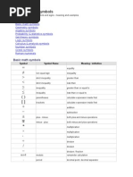 Probability and statistics symbols Symbol P(A) P(A B) P(A B) P(A | B) f (x) Symbol Name probability function probability of events intersection probability of events union conditional probability function probability density function (pdf) Meaning / definition probability of event A P(A) = 0.5 probability that of events A and P(AB) = 0.5 B probability that of events A or B probability of event A given event B occured P(a x b) = f (x) dx P(AB) = 0.5 P(A | B) = 0.3 Example