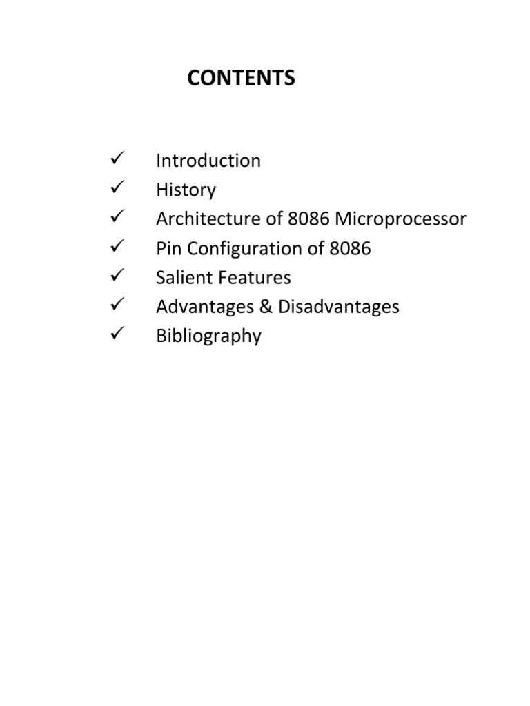 Introduction History Architecture of 8086 Microprocessor Pin Configuration of 8086 Salient Features Advantages & Disadvantages Bibliography