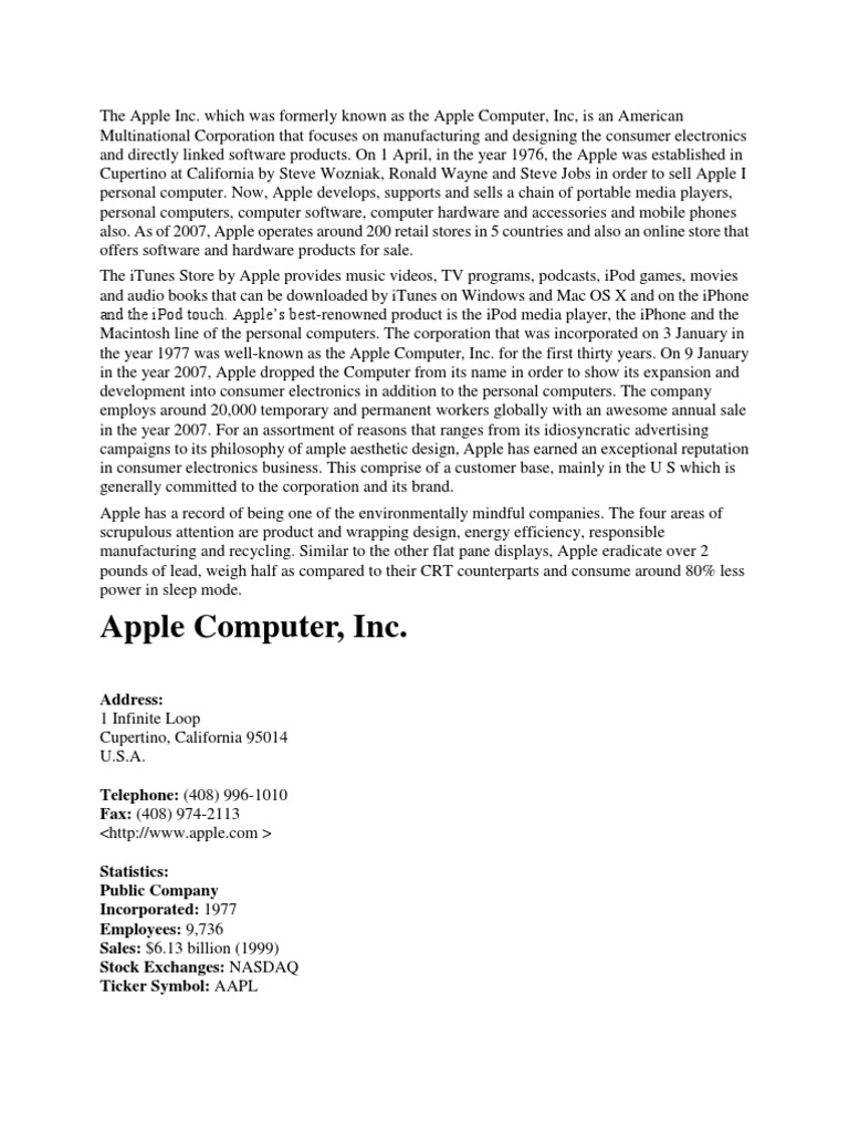 which was formerly known as the Apple Computer, Inc, is an American Multinational Corporation that focuses on manufacturing and designing the consumer electronics and directly linked software products. On 1 April, in the year 1976, the Apple was established in Cupertino at California by Steve Wozniak, Ronald Wayne and Steve Jobs in order to sell Apple I personal computer. Now, Apple develops, supports and sells a chain of portable media players, personal computers, computer software, computer hardware and accessories and mobile phones also. As of 2007, Apple operates around 200 retail stores in 5 countries and also an online store that offers software and hardware products for sale. The iTunes Store by Apple provides music videos, TV programs, podcasts, iPod games, movies and audio books that can be downloaded by iTunes on Windows and Mac OS X and on the iPhone and the iPod touch. Apples best-renowned product is the iPod media player, the iPhone and the Macintosh line of the personal computers. The corporation that was incorporated on 3 January in the year 1977 was well-known as the Apple Computer, Inc. for the first thirty years. On 9 January in the year 2007, Apple dropped the Computer from its name in order to show its expansion and development into consumer electronics in addition to the personal computers. The company employs around 20,000 temporary and permanent workers globally with an awesome annual sale in the year 2007. For an assortment of reasons that ranges from its idiosyncratic advertising campaigns to its philosophy of ample aesthetic design, Apple has earned an exceptional reputation in consumer electronics business. This comprise of a customer base, mainly in the U S which is generally committed to the corporation and its brand. Apple has a record of being one of the environmentally mindful companies. The four areas of scrupulous attention are product and wrapping design, energy efficiency, responsible manufacturing and recycling. Similar to the other flat pane displays, Apple eradicate over 2 pounds of lead, weigh half as compared to their CRT counterparts and consume around 80% less power in sleep mode.