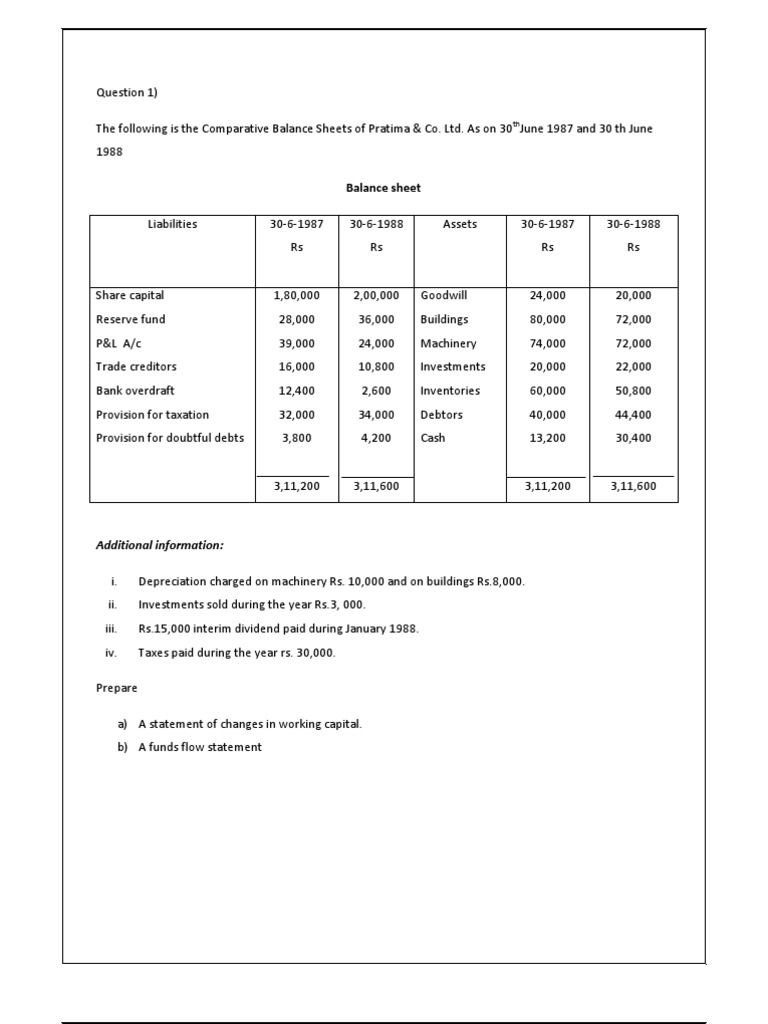 Question 1) The following is the Comparative Balance Sheets of Pratima & Co. Ltd.