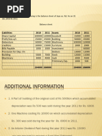Working notes: W.N.1: Particulars To Transfer to reserve fund To Premium on redemption of preference share (2,00,000 X 10%) To Depreciation on: Buildings Machinery Furniture To Dividends To Provision for income tax To Balance c/d 20,000 30,000 2,000 50,000 45,000 1,80,000 3,67,000 Note: 1) Since Tax and dividend are given in the adjustments alone as paid, provision must have been made for them out of profits and immediately payment is made . So, they do not appear in the Balance Sheet. 2) Premium on redemption of preference shares must have been provided out of P&L A/c since Rs.1,00,000 was transferred to capital redemption reserve from reserve fund. W.N.2: Particulars To Balance b/d To Bank (Purchase) (Bal. fig.) Buildings Account Rs. 2,50,000 70,000 3,20,000 Particulars By Depreciation By Balance c/d Rs. 20,000 300,000 3,20,000 3,67,000 20,000 Adjusted Profit and Loss Account Rs. 20,000 Particulars By Balance b/d By Profit on sale of investments (70,000 40,000 ) By Funds from operations (Bal. fig.) 30,000 2,17,000 Rs. 1,20,000