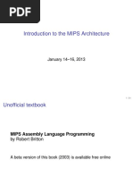 MIPS is a 32-bit datapath: every instruction is 32 bits wide, and data comes in words which are also 32 bits wide. Memory in MIPS, however, is addressed in bytes (so address 0x00000010 refers to the sixteenth byte i.e. the beginning of the fth word). Fortunately, all code and data is aligned in memory, that is, every datum has an address which is a multiple of four. This simplies the datapath design a lot, though you have to keep in mind that every address refers to the byte, not the entry of the physical memory. MIPS is a load-store architecture: that is, the only instructions that access memory are lw and sw. This, again, simplies our design a lot and makes ecient pipelining possible (more about this later). MIPS comes in two avors: big-endian and little-endian. We will be implementing bigendian avor. This means that if a word 0x01234567 is stored in memory starting at byte 0x00000010, the contents of memory are as follows: