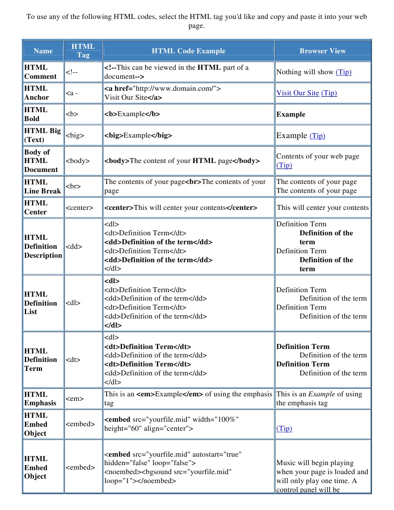 paste it into your web page. Name HTML Comment HTML Anchor HTML Bold HTML Tag <!-<a <b> HTML Code Example <!--This can be viewed in the HTML part of a document--> <a href="http://www.domain.com/"> Visit Our Site</a> <b>Example</b> <big>Example</big> <body>The content of your HTML page</body> The contents of your page<br>The contents of your page <center>This will center your contents</center> <dl> <dt>Definition Term</dt> <dd>Definition of the term</dd> <dt>Definition Term</dt> <dd>Definition of the term</dd> </dl> <dl> <dt>Definition Term</dt> <dd>Definition of the term</dd> <dt>Definition Term</dt> <dd>Definition of the term</dd> </dl> <dl> <dt>Definition Term</dt> <dd>Definition of the term</dd> <dt>Definition Term</dt> <dd>Definition of the term</dd> </dl> Browser View Nothing will show (Tip) Visit Our Site (Tip) Example