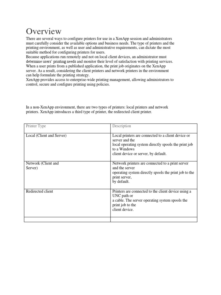In a non-XenApp environment, there are two types of printers: local printers and network printers. XenApp introduces a third type of printer, the redirected client printer.
