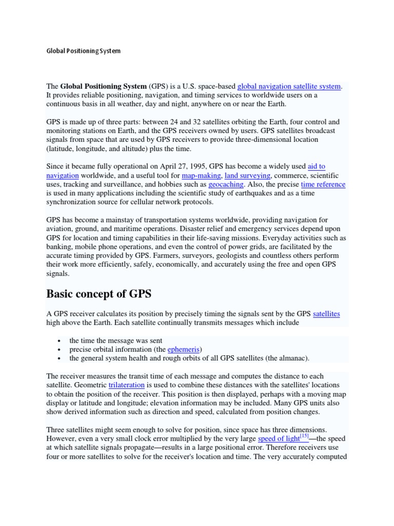 time is effectively hidden by most GPS applications, which use only the location. A few specialized GPS applications do however use the time; these include time transfer, traffic signal timing, and synchronization of cell phone base stations. Although four satellites are required for normal operation, fewer apply in special cases. If one variable is already known, a receiver can determine its position using only three satellites. (For example, a ship or plane may have known elevation.) Some GPS receivers may use additional clues or assumptions (such as reusing the last known altitude, dead reckoning, inertial navigation, or including information from the vehicle computer) to give a degraded position when fewer than four satellites are visible (see [16], Chapters 7 and 8 of [17], and [18]). [edit] Position calculation introduction To provide an introductory description of how a GPS receiver works, errors will be ignored in this section. Using messages received from a minimum of four visible satellites, a GPS receiver is able to determine the times sent and then the satellite positions corresponding to these times sent. The x, y, and z components of position, and the time sent, are designated as where the subscript i is the satellite number and has the value 1, 2, 3, or 4. Knowing the indicated time the message was received , the GPS receiver can compute the transit time of the message as . Assuming the message traveled at the speed of light, c, the distance traveled, . can be computed as