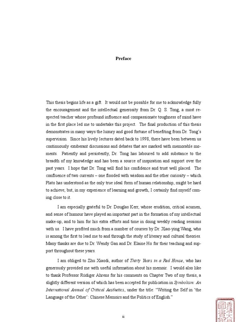 This thesis begins life as a gift. It would not be possible for me to acknowledge fully the encouragement and the intellectual generosity from Dr. Q. S. Tong, a most respected teacher whose profound influence and compassionate toughness of mind have in the first place led me to undertake this project. The final production of this thesis demonstrates in many ways the luxury and good fortune of benefiting from Dr. Tongs supervision. Since his lively lectures dated back to 1998, there have been between us continuously exuberant discussions and debates that are marked with memorable moments. Patiently and persistently, Dr. Tong has laboured to add substance to the breadth of my knowledge and has been a source of inspiration and support over the past years. I hope that Dr. Tong will find his confidence and trust well placed. The confluence of two currents one flooded with wisdom and the other curiosity which Plato has understood as the only true ideal form of human relationship, might be hard to achieve; but, in my experience of learning and growth, I certainly find myself coming close to it. I am especially grateful to Dr. Douglas Kerr, whose erudition, critical acumen, and sense of humour have played an important part in the formation of my intellectual make-up, and to him for his extra efforts and time in doing weekly reading sessions with us. I have profited much from a number of courses by Dr. Xiao-ying Wang, who is among the first to lead me to and through the study of literary and cultural theories. Many thanks are due to Dr. Wendy Gan and Dr. Elaine Ho for their teaching and support throughout these years. I am obliged to Zhu Xiaodi, author of Thirty Years in a Red House, who has generously provided me with useful information about his memoir. I would also like to thank Professor Rdiger Ahrens for his comments on Chapter Two of my thesis, a slightly different version of which has been accepted for publication in Symbolism: An International Annual of Critical Aesthetics, under the title: Writing the Self in the Language of the Other: Chinese Memoirs and the Politics of English.