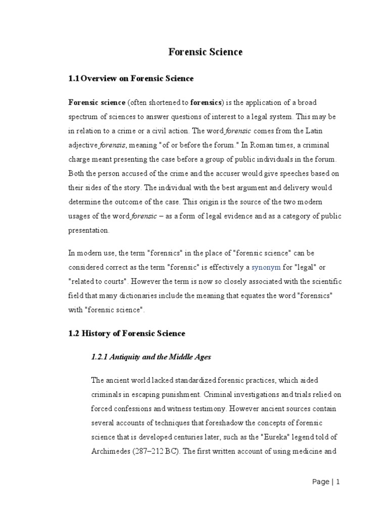 Imagine a world where criminals run freely. Detectives and police officers collect evidence much the same way as they do today, but there is one main difference. Science is not used. Due to the lack of scientific analysis, there would not be a lot of useful evidence. Without the use of science, criminals could not be convicted of their crimes, ranging from common theft to a homicidal rampage, unless there was an eyewitness present at the crime scene when the crime occurred. Murderers would continue killing, thieves would continue stealing, and drug traffickers would continue dealing. Fortunately, in today's world, science is used in solving crimes. Clues a criminal leaves behind can be traced to themselves through scientific evidence. This field of science dealing with criminal investigation is known as forensic science, which roughly means the application of science to law. Forensic science can be used to determine many things from the evidence when it is collected properly without any contamination. The people that need to learn the methods of collecting the evidence for forensic science analysis are those from law enforcement agencies that come into contact with the crime scenes frequently. Unfortunately, nine times out of ten, this person is an officer from a police department, which is lacking in evidence collection training. In other words, scientific concepts and principles are used to convict criminals of their crimes. Due to the great importance of forensic science in the conviction of criminals, the basic ideas and concepts need to be taught to officers of local police departments so that evidence can be collected without contamination in order to keep criminals from continuing to commit crimes that linger on forever in the minds of the victims families and the nation's psyche. Throughout history, evidence has been used to convict criminals of the crimes that they have committed. Todays society has improved upon the methods of the past to