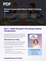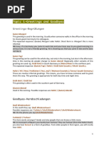 1. GREETINGS In German, the word you will often hear to say Hi or Hello to someone is Hallo. It is clearly similar to the English greeting, and just like hello it is always used to greet peers, such as classmates, or people you know very well, like relatives and friends. In other words, this is an informal greeting. Formal greetings are instead more indicated when you are saying hello to a person you meet for the first time, as well as older people or someone in authority, for example a doctor, a teacher, a police officer. So, you say: - Guten Morgen until about noon; then, until 5 pm, the correct form is Guten Tag (both expressions correspond to Good morning). - In the evening you use Guten Abend for Good evening. - At night you finally say Gute Nacht. In general, if you want to say goodbye to someone, you can use Tschss, which is more informal, or Auf Wiedersehen, which is its formal equivalent. Auf Wiedersehen literally means see you again. To sum up, here is a short recap of all German greetings. YOU ARE GREETING A FRIEND: Hallo (Hi, Hello) - Tschss (Bye) - Gute Nacht (Good night) A STRANGER: Guten Morgen (until 12 am) - Guten Tag (until 5 pm) - Guten Abend (Good evening) - Auf Wiedersehen (See you) - Gute Nacht (Good night)
