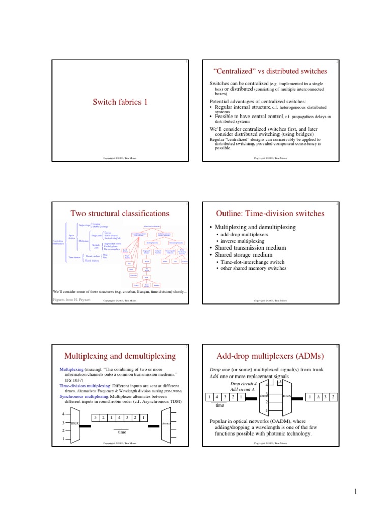Used in PBXs & after a space-division switch to resequence traffic Scalability: Can multiplex multiple physical inputs to TSI input, but memory bandwidth increases in proportion to aggregate input bandwidth. Memory size is proportional to number of inputs (if allowing switching between arbitrary sets of ports) Note that this circuit switch does have buffering (albeit small, since arrivals are deterministic) i.e. it is not just packet switches that have buffers.