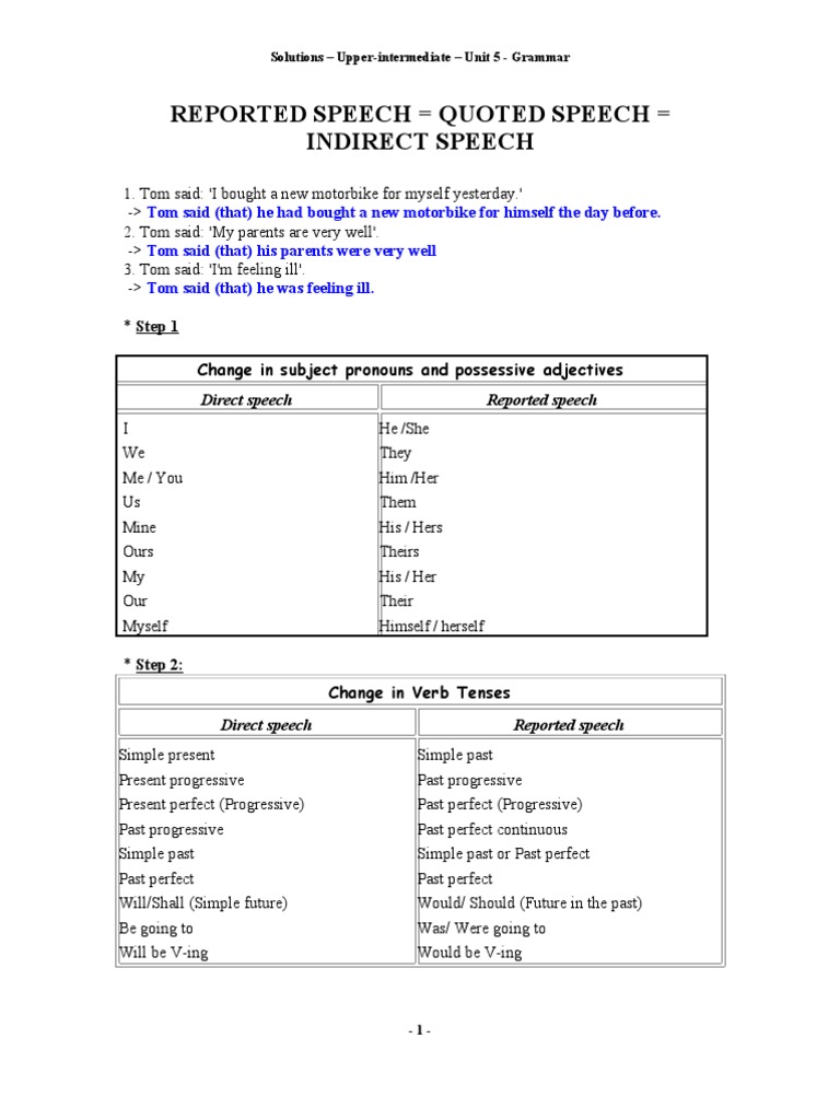1. Tom said: 'I bought a new motorbike for myself yesterday.' -> Tom said (that) he had bought a new motorbike for himself the day before. 2. Tom said: 'My parents are very well'. -> Tom said (that) his parents were very well 3. Tom said: 'I'm feeling ill'. -> Tom said (that) he was feeling ill. * Step 1 Change in subject pronouns and possessive adjectives Direct speech