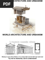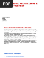 This document provides an overview of prehistoric architecture from around the world. It describes some of the earliest human settlements dating back 35,000 years, which consisted of small family groups living in huts. Later, around 8000 BC, some of the first urban communities emerged like Jericho and Catal Huyuk, which had fortified walls, rectangular mudbrick houses, and evidence of social organization. In Western Europe, megalithic structures like standing stones, stone circles, and burial chambers were constructed out of massive stones beginning around 5000 BC. One of the earliest preserved wooden settlements was discovered at Biskupin in Poland dating to 1000-500 BC, which had houses, streets, and fortified walls made entirely of