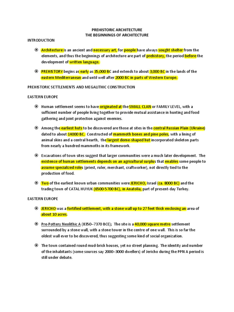 s sought shelter from the elements, and thus the beginnings of architecture are part of prehistory, the period before the development of written language. PREHISTORY begins as early as 35,000 BC and extends to about 3,000 BC in the lands of the eastern Mediterranean and until well after 2000 BC in parts of Western Europe. PREHISTORIC SETTLEMENTS AND MEGALITHIC CONSTRUCTION EASTERN EUROPE Human settlement seems to have originated at the SMALL CLAN or FAMILY LEVEL, with a sufficient number of people living together to provide mutual assistance in hunting and food gathering and joint protection against enemies. Among the earliest huts to be discovered are those at sites in the central Russian Plain (Ukraine) dated to about 14000 BC. Constructed of mammoth bones and pine poles, with a lining of animal skins and a central hearth, the largest dome-shaped hut incorporated skeleton parts from nearly a hundred mammoths in its framework. Excavations of town sites suggest that larger communities were a much later development. The existence of human settlements depends on an agricultural surplus that enables some people to assume specialized roles (priest, ruler, merchant, craftworker), not directly tied to the production of food. Two of the earliest known urban communities were JERICHO, Israel (ca. 8000 BC) and the trading town of CATAL HUYUK (6500-5700 BC), in Anatolia, part of present-day Turkey. EASTERN EUROPE JERICHO was a fortified settlement, with a stone wall up to 27 feet thick enclosing an area of about 10 acres. Pre-Pottery Neolithic A (83507370 BCE); The site is a 40,000 square metre settlement surrounded by a stone wall, with a stone tower in the centre of one wall. This is so far the oldest wall ever to be discovered, thus suggesting some kind of social organization. The town contained round mud-brick houses, yet no street planning. The identity and number of the inhabitants (some sources say 20003000 dwellers) of Jericho during the PPN A period is still under debate.