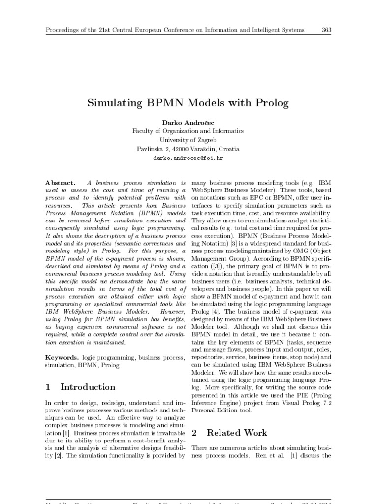 many business process modeling tools (e.g. IBM WebSphere Business Modeler). These tools, based on notations such as EPC or BPMN, oer user interfaces to specify simulation parameters such as task execution time, cost, and resource availability. They allow users to run simulations and get statistical results (e.g. total cost and time required for process execution). BPMN (Business Process Modeling Notation) [3] is a widespread standard for business process modeling maintained by OMG (Object Management Group). According to BPMN specication ([3]), the primary goal of BPMN is to provide a notation that is readily understandable by all business users (i.e. business analysts, technical developers and business people). In this paper we will show a BPMN model of e-payment and how it can be simulated using the logic programming language Prolog [4]. The business model of e-payment was designed by means of the IBM WebSphere Business Modeler tool. Although we shall not discuss this BPMN model in detail, we use it because it contains the key elements of BPMN (tasks, sequence and message ows, process input and output, roles, repositories, service, business items, stop node) and Keywords. logic programming, business process, can be simulated using IBM WebSphere Business simulation, BPMN, Prolog Modeler. We will show how the same results are obtained using the logic programming language Prolog. More specically, for writing the source code 1 Introduction presented in this article we used the PIE (Prolog In order to design, redesign, understand and im- Inference Engine) project from Visual Prolog 7.2 prove business processes various methods and tech- Personal Edition tool. niques can be used. An eective way to analyze complex business processes is modeling and simulation [1]. Business process simulation is invaluable 2 Related Work due to its ability to perform a cost-benet analysis and the analysis of alternative designs feasibil- There are numerous articles about simulating busiity [2]. The simulation functionality is provided by ness process models. Ren et al. [1] discuss the