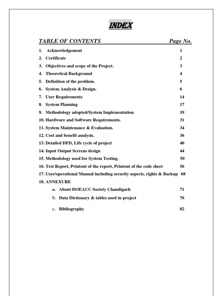 1. Acknowledgement 2. Certificate 3. Objectives and scope of the Project. 4. Theoretical Background 5. Definition of the problem. 6. System Analysis & Design. 7. User Requirements 8. System Planning 9. Methodology adopted/System Implementation 10. Hardware and Software Requirements. 11. System Maintenance & Evaluation. 12. Cost and benefit analysis. 13. Detailed DFD, Life cycle of project 14. Input Output Screens design 15. Methodology used for System Testing. 16. Test Report, Printout of the report, Printout of the code sheet