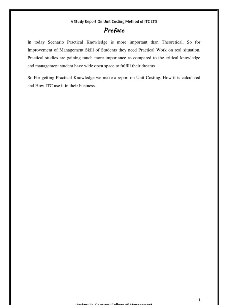 In today Scenario Practical Knowledge is more important than Theoretical. So for Improvement of Management Skill of Students they need Practical Work on real situation. Practical studies are gaining much more importance as compared to the critical knowledge and management student have wide open space to fulfill their dreams So For getting Practical Knowledge we make a report on Unit Costing. How it is calculated and How ITC use it in their business.