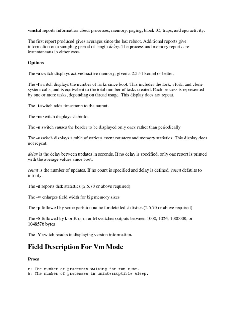The first report produced gives averages since the last reboot. Additional reports give information on a sampling period of length delay. The process and memory reports are instantaneous in either case. Options The -a switch displays active/inactive memory, given a 2.5.41 kernel or better. The -f switch displays the number of forks since boot. This includes the fork, vfork, and clone system calls, and is equivalent to the total number of tasks created. Each process is represented by one or more tasks, depending on thread usage. This display does not repeat. The -t switch adds timestamp to the output. The -m switch displays slabinfo. The -n switch causes the header to be displayed only once rather than periodically. The -s switch displays a table of various event counters and memory statistics. This display does not repeat. delay is the delay between updates in seconds. If no delay is specified, only one report is printed with the average values since boot. count is the number of updates. If no count is specified and delay is defined, count defaults to infinity. The -d reports disk statistics (2.5.70 or above required) The -w enlarges field width for big memory sizes The -p followed by some partition name for detailed statistics (2.5.70 or above required) The -S followed by k or K or m or M switches outputs between 1000, 1024, 1000000, or 1048576 bytes The -V switch results in displaying version information.