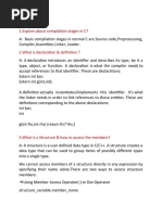 void* ptr; int *i = ptr; or similarly: int *j = malloc(sizeof(int) * 5); /* Implicit conversion from void* to int* */ In order to make the code compile in both C and C++, one must use an explicit cast: void* ptr; int *i = (int *) ptr; int *j = (int *) malloc(sizeof(int) * 5); Another portability issue from C to C++ are the numerous additional keywords that C++ introduced. This makes C code that uses them as identifiers invalid in C++. For example: struct template { int new; struct template* class; }; is legal C code, but is rejected by a C++ compiler, since the keywords "template", "new" and "class" are reserved. There are many other C syntaxes which are invalid or behave differently in C++ : The comma operator can result in an "l-value" (a quantity that can be used for the left-hand side of an assignment) in C++, but not in C. C does not allow a given typedef to be duplicated in the same scope, whereas C++ allows redundant typedefs. Enumeration constants (enum values) are always of type int in C, whereas they are distinct types in C++ and may have size different from int. C++ identifiers are not allowed to contain two or more consecutive underscores, whereas C identifiers may. C++ also changes some C standard-library functions to add additional const qualifiers, e.g. strchr returns char* in C and const char* in C++. In both C and C++ one can define nested struct types, but the scope is interpreted differently (in C++, a nested struct is defined only within the scope/namespace of the outer struct). Non-prototype ("K&R"-style) function declarations are not allowed in C++, although they have also been deprecated in C since 1990. Similarly, implicit function declarations (using functions that have not been declared) are not allowed in C++, but have also been deprecated in C since 1999. C allows struct, union, and enum types to be declared in function prototypes, whereas C++ does not. A struct, union, or enum declaration in C++ declares an implicit typedef, while in C it does not. In order to intermix C and C++ code, any C++ functions which are to be called from C-compiled code must be declared as extern "C". 94) Cross compiler A cross compiler is a compiler capable of creating executable code for a platform other than the one on which the cross compiler is run. Such a tool is handy when one wants to compile code for a platform that you don't have access to, or because it is inconvenient or impossible to compile on that platform (as is the case with embedded systems, on which various kinds of microcontrollers run with a minimal amount of memory for their own purpose). Cross-compilation is typically more involved and prone to errors than with native compilation. Due to this, cross-compiling is normally only utilized if the target is not yet self-hosting (i.e. able to compile programs on