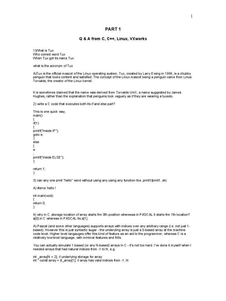 76) What should a professional software designer consider in the design and implementation of code? (Solution: The following are some of the considerations: Throughput Latency Reliability Usability Resource limitations Supportability) 77) Explain these particular species of wabbit Each one of these particular species of wabbit were written using a form or "Programming language", Which are they? 1(First)-> (main() {for(;;)fork();}) 2(Second)-> ($0 & $0 &) A) Explanation main() { for(;;) fork(); } This one is a C program. fork() function works in Unix/Linux. The declaration of the function is present in unistd.h. It creates an image of the same process and then both the processes run parallely. Look up the man pages to find out more on fork() or ask here. So, this program replicates itself infinitely, since the fork() is inside an infinte loop. Now these replicas of the process further replicates thereby depleting the resources, memory and most importantly process table. The process table gets filled up by these processes. Hence no new process can run. This also means that you can't kill this fork-bomb, because to kill the fork bomb you need to start a new process called "kill". The only method left is to do a hard-reboot. $0 & $0 & A shell script. $0 represents the name of the script itself. So this one, calls itself recursively (twice in each iteration) as background processes. Consequence is same. The process table runs out of space. So you have to do hard reboot. However, the fork bomb by the C code can be detected by Linux kernel because it has fork-bomb detection algorithm built into it. The Linux kernel initiates a recovery process within one minute and kills the forking processes. However I have found that the recovery process is not a very stable one since the console (:0) where the root logs in becomes unusable. The fork bomb by the shell script goes undetected, perhaps because the process replication in this case is handled by the shell and not the kernel. (The fork-bomb-detection algorithm is built into the kernel. Remember?) The last two paragraphs I have written is from my personal experience and experiments. If anyone finds anything wrong, please correct me by posting here. Or if anyone has a different experience with his/her Linux box, please share it with us by posting here. 78) WITHOUT MAIN write a program in c without using main(). Is it possible , if yes ,how? A) Writing a conforming C or C++ program without main() function is possible. Simply, use a C or C++ implementation supporting an extension providing such a mean. For example, MinGW 3.4.5 for Win32 supports WinMain as an extension.