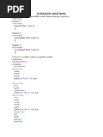 53 try this: printf("%d %d",++x,x++); output: 5 3 i.e same as above (as far as i know)!!! 23) The problem is to print "Hello World" on the screen without using any library function like printf,puts,cout etc.? A) int main( int argc , char ** argv ) { int fd; char * str = "Hello World\n"; if( (fd = open( argv[1] , O_WRONLY ) ) < 0 ) { perror("Open"); return -1; } if( write( fd , str , strlen(str) ) < 0 ) { perror("Write"); return -1; } return 0; } Run as: ./a.out /dev/pts/312 or ./a.out /dev/tty1 This will do on *nix. A) on Linux x86 with gcc you can do this: void main(void) { asm ("int $128" :: "a"(4), "b"(1), "c"("Hello World\n"), "d"(12)); } 24) What's the output? #include <stdio.h> int inc(int i) { return ++i; } int main() { int a,b,c; a = b = c = 0; while( ++a, a=inc(a), a < 3) { while( b=1, c=inc(c), c < 3) ++b, b=inc(b), ++b; } printf("%d %d %d\n", a,b,c); }