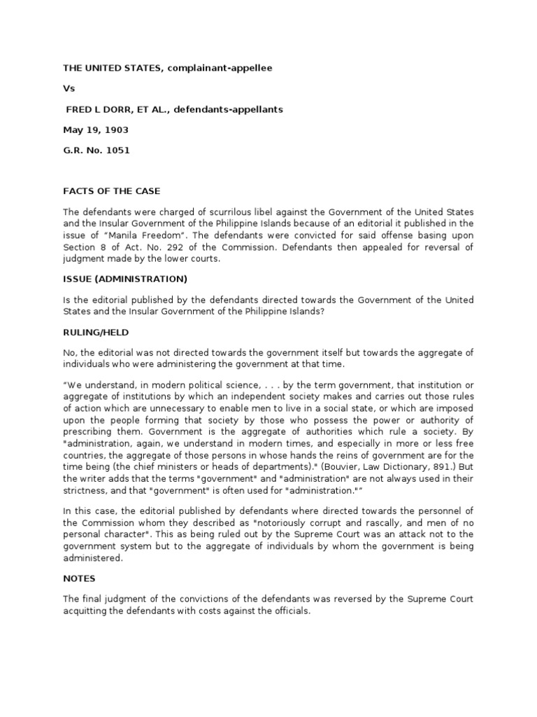 FACTS OF THE CASE The defendants were charged of scurrilous libel against the Government of the United States and the Insular Government of the Philippine Islands because of an editorial it published in the issue of Manila Freedom. The defendants were convicted for said offense basing upon Section 8 of Act. No. 292 of the Commission. Defendants then appealed for reversal of judgment made by the lower courts. ISSUE (ADMINISTRATION) Is the editorial published by the defendants directed towards the Government of the United States and the Insular Government of the Philippine Islands? RULING/HELD No, the editorial was not directed towards the government itself but towards the aggregate of individuals who were administering the government at that time. We understand, in modern political science, . . . by the term government, that institution or aggregate of institutions by which an independent society makes and carries out those rules of action which are unnecessary to enable men to live in a social state, or which are imposed upon the people forming that society by those who possess the power or authority of prescribing them. Government is the aggregate of authorities which rule a society. By "administration, again, we understand in modern times, and especially in more or less free countries, the aggregate of those persons in whose hands the reins of government are for the time being (the chief ministers or heads of departments)." (Bouvier, Law Dictionary, 891.) But the writer adds that the terms "government" and "administration" are not always used in their strictness, and that "government" is often used for "administration." In this case, the editorial published by defendants where directed towards the personnel of the Commission whom they described as "notoriously corrupt and rascally, and men of no personal character". This as being ruled out by the Supreme Court was an attack not to the government system but to the aggregate of individuals by whom the government is being administered. NOTES The final judgment of the convictions of the defendants was reversed by the Supreme Court acquitting the defendants with costs against the officials.