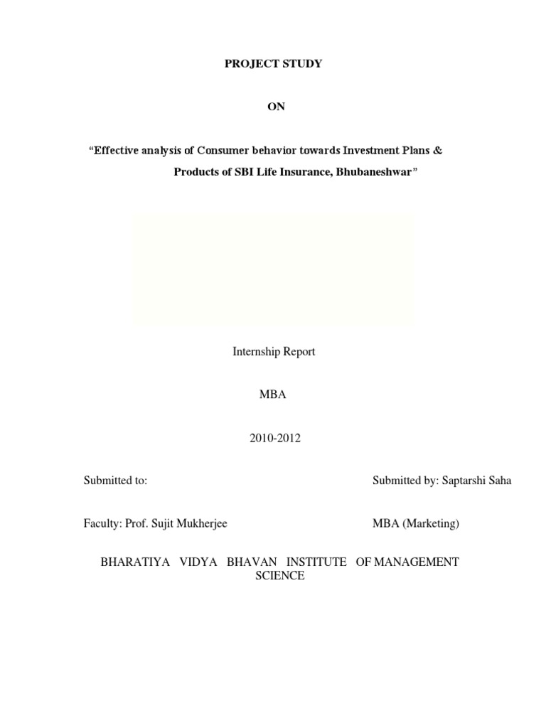 Consumer behavior towards Investment Plans & Products of SBI Life Insurance, guidance of has been submitted by Prof. sujit Mukherjee in as Saptarshi saha a partial