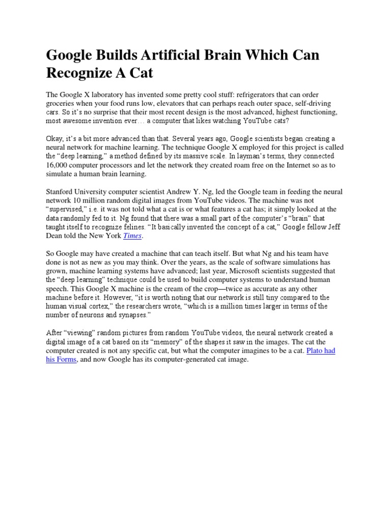 The Google X laboratory has invented some pretty cool stuff: refrigerators that can order groceries when your food runs low, elevators that can perhaps reach outer space, self-driving cars. So its no surprise that their most recent design is the most advanced, highest functioning, most awesome invention ever a computer that likes watching YouTube cats? Okay, its a bit more advanced than that. Several years ago, Google scientists began creating a neural network for machine learning. The technique Google X employed for this project is called the deep learning, a method defined by its massive scale. In laymans terms, they connected 16,000 computer processors and let the network they created roam free on the Internet so as to simulate a human brain learning. Stanford University computer scientist Andrew Y. Ng, led the Google team in feeding the neural network 10 million random digital images from YouTube videos. The machine was not supervised, i.e. it was not told what a cat is or what features a cat has; it simply looked at the data randomly fed to it. Ng found that there was a small part of the computers brain that taught itself to recognize felines. It basically invented the concept of a cat, Google fellow Jeff Dean told the New York Times. So Google may have created a machine that can teach itself. But what Ng and his team have done is not as new as you may think. Over the years, as the scale of software simulations has grown, machine learning systems have advanced; last year, Microsoft scientists suggested that the deep learning technique could be used to build computer systems to understand human speech. This Google X machine is the cream of the croptwice as accurate as any other machine before it. However, it is worth noting that our network is still tiny compared to the human visual cortex, the researchers wrote, which is a million times larger in terms of the number of neurons and synapses. After viewing random pictures from random YouTube videos, the neural network created a digital image of a cat based on its memory of the shapes it saw in the images. The cat the computer created is not any specific cat, but what the computer imagines to be a cat. Plato had his Forms, and now Google has its computer-generated cat image.