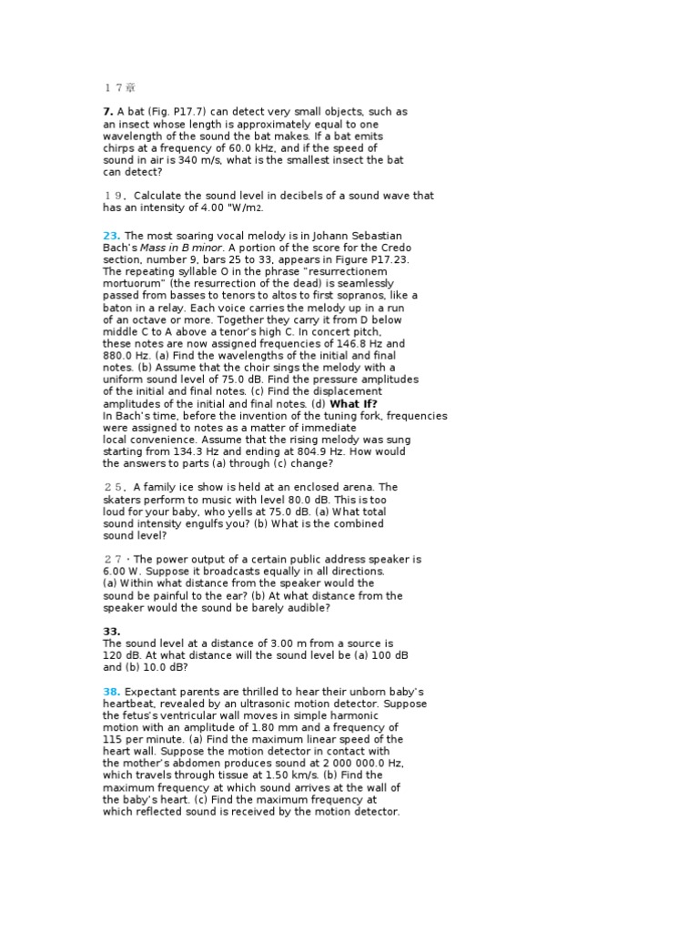 7) can detect very small objects, such as an insect whose length is approximately equal to one wavelength of the sound the bat makes. If a bat emits chirps at a frequency of 60.0 kHz, and if the speed of sound in air is 340 m/s, what is the smallest insect the bat can detect? Calculate the sound level in decibels of a sound wave that has an intensity of 4.00 "W/m2. 23. The most soaring vocal melody is in Johann Sebastian Bachs Mass in B minor. A portion of the score for the Credo section, number 9, bars 25 to 33, appears in Figure P17.23. The repeating syllable O in the phrase resurrectionem mortuorum (the resurrection of the dead) is seamlessly passed from basses to tenors to altos to first sopranos, like a baton in a relay. Each voice carries the melody up in a run of an octave or more. Together they carry it from D below middle C to A above a tenors high C. In concert pitch, these notes are now assigned frequencies of 146.8 Hz and 880.0 Hz. (a) Find the wavelengths of the initial and final notes. (b) Assume that the choir sings the melody with a uniform sound level of 75.0 dB. Find the pressure amplitudes of the initial and final notes. (c) Find the displacement amplitudes of the initial and final notes. (d) What If? In Bachs time, before the invention of the tuning fork, frequencies were assigned to notes as a matter of immediate local convenience. Assume that the rising melody was sung starting from 134.3 Hz and ending at 804.9 Hz. How would the answers to parts (a) through (c) change? A family ice show is held at an enclosed arena. The skaters perform to music with level 80.0 dB. This is too loud for your baby, who yells at 75.0 dB. (a) What total sound intensity engulfs you? (b) What is the combined sound level? The power output of a certain public address speaker is 6.00 W. Suppose it broadcasts equally in all directions. (a) Within what distance from the speaker would the sound be painful to the ear? (b) At what distance from the speaker would the sound be barely audible? 33. The sound level at a distance of 3.00 m from a source is 120 dB. At what distance will the sound level be (a) 100 dB and (b) 10.0 dB? 38. Expectant parents are thrilled to hear their unborn babys heartbeat, revealed by an ultrasonic motion detector. Suppose the fetuss ventricular wall moves in simple harmonic motion with an amplitude of 1.80 mm and a frequency of 115 per minute. (a) Find the maximum linear speed of the heart wall. Suppose the motion detector in contact with the mothers abdomen produces sound at 2 000 000.0 Hz, which travels through tissue at 1.50 km/s. (b) Find the maximum frequency at which sound arrives at the wall of the babys heart. (c) Find the maximum frequency at which reflected sound is received by the motion detector.