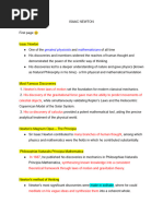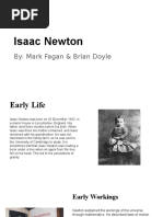 (just as the "shadows of a cone" yield all quadratic curves, Newton found a curve whose "shadows" yield all cubic curves). He proved that same-mass spheres of any radius have equal gravitational attraction: this fact is key to celestial motions. He discovered Puiseux series almost two centuries before they were re-invented by Puiseux. (Like some of the greatest ancient mathematicians, Newton took the time to compute an approximation to ; his was better than Vieta's, though still not as accurate as al-Kashi's.) Newton is so famous for his calculus, optics and laws of motion, it is easy to overlook that he was also one of the greatest geometers. He solved the Delian cube-doubling problem. Even before the invention of the calculus of variations, Newton was doing difficult work in that field, e.g. his calculation of the "optimal bullet shape." Among many marvelous theorems, he proved several about quadrilaterals and their in- or circum-scribing ellipses, and constructed the parabola defined by four given points. He anticipated Poncelet's Principle of Continuity. An anecdote often cited to demonstrate his brilliance is the problem of thebrachistochrone, which had baffled the best mathematicians in Europe, and came to Newton's attention late in life. He solved it in a few hours and published the answer anonymously. But on seeing the solution Jacob Bernoulli immediately exclaimed "I recognize the lion by his footprint." In 1687 Newton published Philosophiae Naturalis Principia Mathematica, surely the greatest scientific book ever written. The motion of the planets was not understood before Newton, although theheliocentric system allowed Kepler to describe the orbits. In Principia Newton analyzed the consequences of his Laws of Motion and introduced the Law of Universal Gravitation. (In this work Newton also proved important theorems about inverse-cube forces, work largely unappreciated until Chandrasekhar's modern-day work.) The notion that the Earth rotated about the Sun was introduced in ancient Greece, but Newton explained why it did, and the Great Scientific Revolution began. Newton once wrote "Truth is ever to be found in the simplicity, and not in the multiplicity and confusion of things." Sir Isaac Newton was buried at Westminster Abbey in a tomb inscribed "Let mortals rejoice that so great an ornament to the human race has existed." Newton ranks #2 on Michael Hart's famous list of the Most Influential Persons in History. (Muhammed the Prophet of Allah is #1.) Whatever the criteria, Newton would certainly rank first on any list of physicists, or scientists in general, but some listmakers would demote him slightly on a list of pure mathematicians: his emphasis was physics not mathematics, and the contribution of Leibniz (Newton's rival for the title Inventor of Calculus) lessens the historical importance of Newton's calculus. One reason I've ranked him at #1 is a comment by Gottfried Leibniz himself: "Taking