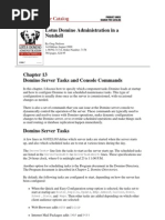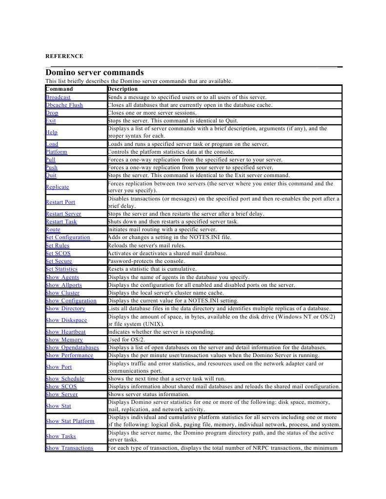 This list briefly describes the Domino server commands that are available. Command Description Broadcast Sends a message to specified users or to all users of this server. Dbcache Flush Closes all databases that are currently open in the database cache. Drop Closes one or more server sessions. Exit Stops the server. This command is identical to Quit. Displays a list of server commands with a brief description, arguments (if any), and the Help proper syntax for each. Load Loads and runs a specified server task or program on the server. Platform Controls the platform statistics data at the console. Pull Forces a one-way replication from the specified server to your server. Push Forces a one-way replication from your server to specified server. Quit Stops the server. This command is identical to the Exit server command. Forces replication between two servers (the server where you enter this command and the Replicate server you specify). Disables transactions (or messages) on the specified port and then re-enables the port after a Restart Port brief delay. Restart Server Stops the server and then restarts the server after a brief delay. Restart Task Shuts down and then restarts a specified server task. Route Initiates mail routing with a specific server. Set Configuration Adds or changes a setting in the NOTES.INI file. Set Rules Reloads the server's mail rules. Set SCOS Activates or deactivates a shared mail database. Set Secure Password-protects the console. Set Statistics Resets a statistic that is cumulative. Show Agents Displays the name of agents in the database you specify. Show Allports Displays the configuration for all enabled and disabled ports on the server. Show Cluster Displays the local server's cluster name cache. Show Configuration Displays the current value for a NOTES.INI setting. Show Directory Lists all database files in the data directory and identifies multiple replicas of a database. Displays the amount of space, in bytes, available on the disk drive (Windows NT or OS/2) Show Diskspace or file system (UNIX). Show Heartbeat Indicates whether the server is responding. Show Memory Used for OS/2. Show Opendatabases Displays a list of open databases on the server and detail information for the databases. Show Performance Displays the per minute user/transaction values when the Domino Server is running. Displays traffic and error statistics, and resources used on the network adapter card or Show Port communications port. Show Schedule Shows the next time that a server task will run. Show SCOS Displays information about shared mail databases and reloads the shared mail configuration. Show Server Shows server status information. Displays Domino server statistics for one or more of the following: disk space, memory, Show Stat mail, replication, and network activity. Displays individual and cumulative platform statistics for all servers including one or more Show Stat Platform of the following: logical disk, paging file, memory, individual network, process, and system. Displays the server name, the Domino program directory path, and the status of the active Show Tasks server tasks. Show Transactions For each type of transaction, displays the total number of NRPC transactions, the minimum