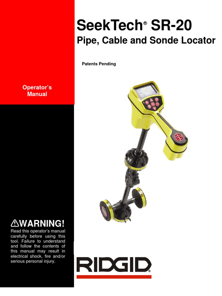 The SR-20 is a diagnostic tool that senses electromagnetic fields emitted by objects underground. It is meant to aide the user in locating these objects by recognizing characteristics of the field lines and displaying them on the screen. As electromagnetic field lines can be distorted and interfered with, it is important to verify the location of underground objects before digging. Several utilities may be underground in the same area. Be sure to follow local guidelines and one-call service procedures. Exposing the utility is the only way to verify its existence, location, and depth. Ridge Tool Co., its affiliates and suppliers, will not be liable for any injury or any direct, indirect, incidental or consequential damages sustained or incurred by reason of the use of the SR-20.