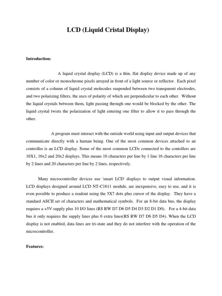 even possible to produce a readout using the 5X7 dots plus cursor of the display. They have a available. Line len standard ASCII set of characters and mathematical symbols. For an 8-bit data bus, the display requires a +5V supply plus 10 I/O lines (RS RW D7 D6 D5 D4 D3 D2 D1 D0). For a 4-bit data bus it only requires the supply lines plus 6 extra lines(RS RW D7 D6 D5 D4). When the LCD display is not enabled, data lines are tri-state and they do not interfere with the operation of the microcontroller.