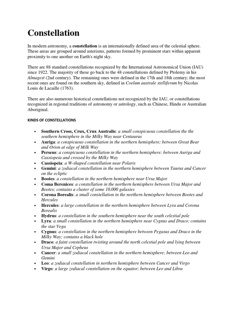 Southern Cross, Crux, Crux Australis: a small conspicuous constellation the the southern hemisphere in the Milky Way near Centaurus Auriga: a conspicuous constellation in the northern hemisphere; between Great Bear and Orion at edge of Milk Way Perseus: a conspicuous constellation in the northern hemisphere; between Auriga and Cassiopeia and crossed by the Milky Way Cassiopeia: a W-shaped constellation near Polaris Gemini: a zodiacal constellation in the northern hemisphere between Taurus and Cancer on the ecliptic Bootes: a constellation in the northern hemisphere near Ursa Major Coma Berenices: a constellation in the northern hemisphere between Ursa Major and Bootes; contains a cluster of some 10,000 galaxies Corona Borealis: a small constellation in the northern hemisphere between Bootes and Hercules Hercules: a large constellation in the northern hemisphere between Lyra and Corona Borealis Hydrus: a constellation in the southern hemisphere near the south celestial pole Lyra: a small constellation in the northern hemisphere near Cygnus and Draco; contains the star Vega Cygnus: a constellation in the northern hemisphere between Pegasus and Draco in the Milky Way; contains a black hole Draco: a faint constellation twisting around the north celestial pole and lying between Ursa Major and Cepheus Cancer: a small zodiacal constellation in the northern hemisphere; between Leo and Gemini Leo: a zodiacal constellation in northern hemisphere between Cancer and Virgo Virgo: a large zodiacal constellation on the equator; between Leo and Libra