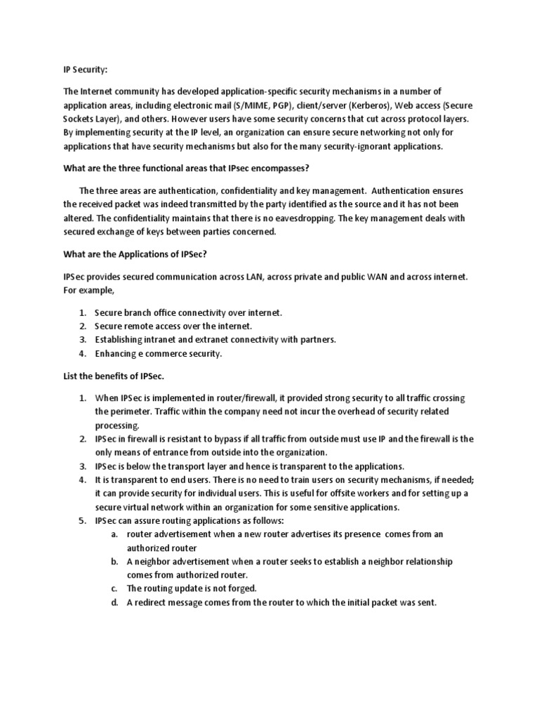 (S/MIME, PGP), client/server (Kerberos), Web access (Secure Sockets Layer), and others. However users have some security concerns that cut across protocol layers. By implementing security at the IP level, an organization can ensure secure networking not only for applications that have security mechanisms but also for the many security-ignorant applications. What are the three functional areas that IPsec encompasses? The three areas are authentication, confidentiality and key management. Authentication ensures the received packet was indeed transmitted by the party identified as the source and it has not been altered. The confidentiality maintains that there is no eavesdropping. The key management deals with secured exchange of keys between parties concerned. What are the Applications of IPSec? IPSec provides secured communication across LAN, across private and public WAN and across internet. For example, 1. 2. 3. 4. Secure branch office connectivity over internet. Secure remote access over the internet. Establishing intranet and extranet connectivity with partners. Enhancing e commerce security.