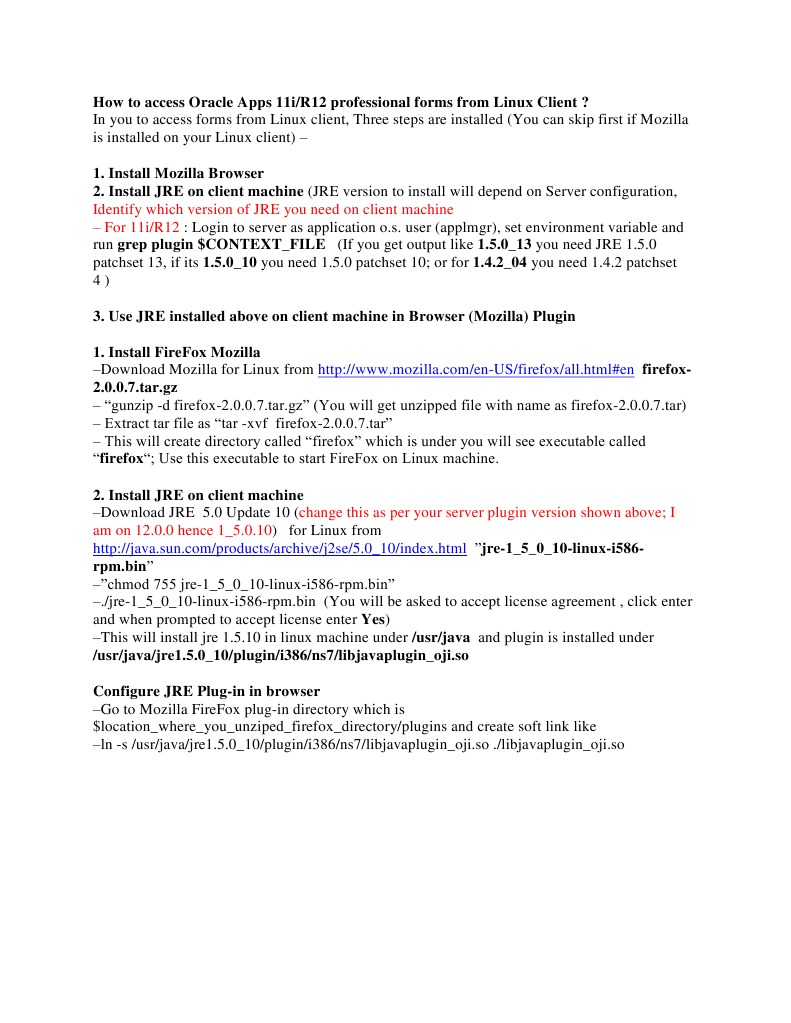 In you to access forms from Linux client, Three steps are installed (You can skip first if Mozilla is installed on your Linux client) 1. Install Mozilla Browser 2. Install JRE on client machine (JRE version to install will depend on Server configuration, Identify which version of JRE you need on client machine For 11i/R12 : Login to server as application o.s. user (applmgr), set environment variable and run grep plugin $CONTEXT_FILE (If you get output like 1.5.0_13 you need JRE 1.5.0 patchset 13, if its 1.5.0_10 you need 1.5.0 patchset 10; or for 1.4.2_04 you need 1.4.2 patchset 4) 3. Use JRE installed above on client machine in Browser (Mozilla) Plugin 1. Install FireFox Mozilla Download Mozilla for Linux from http://www.mozilla.com/en-US/firefox/all.html#en firefox2.0.0.7.tar.gz gunzip -d firefox-2.0.0.7.tar.gz (You will get unzipped file with name as firefox-2.0.0.7.tar) Extract tar file as tar -xvf firefox-2.0.0.7.tar This will create directory called firefox which is under you will see executable called firefox; Use this executable to start FireFox on Linux machine. 2. Install JRE on client machine Download JRE 5.0 Update 10 (change this as per your server plugin version shown above; I am on 12.0.0 hence 1_5.0.10) for Linux from http://java.sun.com/products/archive/j2se/5.0_10/index.html jre-1_5_0_10-linux-i586rpm.bin chmod 755 jre-1_5_0_10-linux-i586-rpm.bin ./jre-1_5_0_10-linux-i586-rpm.bin (You will be asked to accept license agreement , click enter and when prompted to accept license enter Yes) This will install jre 1.5.10 in linux machine under /usr/java and plugin is installed under /usr/java/jre1.5.0_10/plugin/i386/ns7/libjavaplugin_oji.so Configure JRE Plug-in in browser Go to Mozilla FireFox plug-in directory which is $location_where_you_unziped_firefox_directory/plugins and create soft link like ln -s /usr/java/jre1.5.0_10/plugin/i386/ns7/libjavaplugin_oji.so ./libjavaplugin_oji.so